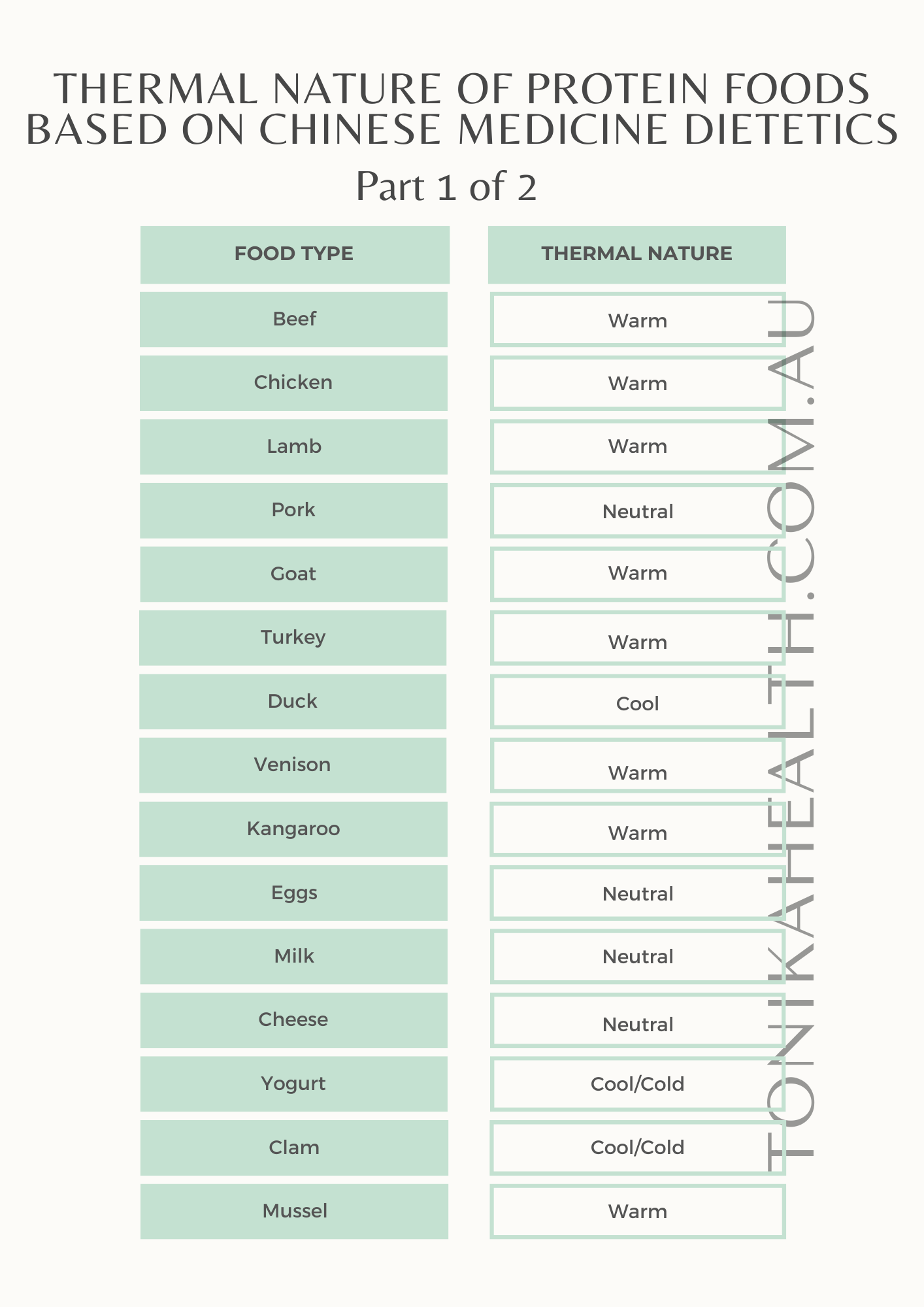 As this article is primarily focused on protein, and we don’t have the scope to provide a large list of other food groups, we have put charts together below with the different thermal natures of a variety of protein foods, so that you can use these charts to guide you in selecting protein foods based on their thermal nature.