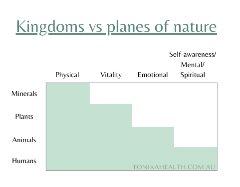 This chart is based on correspondences between the Mineral, Vegetable (plant), Animal and Human kingdoms, and the Planes of Nature, which represent subtle levels of our being including the physical body, but also beyond the physical. Simply put, these planes are the Physical (our Physical body), Etheric/Vitality (Energetic), Emotional/Astral (Emotions), Mental (Thoughts), and 3 various/diverse Spiritual planes (we won’t cover here as they don’t pertain too much to this article). Our being in fact traverses all of these planes, but it is of course the denser aspects of Physical, Energetic, Emotional and Mental that we are more aware of in our day to day lives, and what we primarily focus on with health (with some also focusing on the important aspects of the Spiritual too).