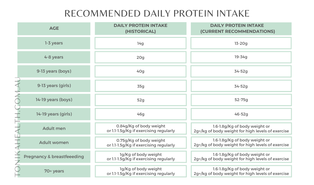 The table below shows the historical recommended dietary intake of protein per day compared with the ranges suggested by current scientific research.