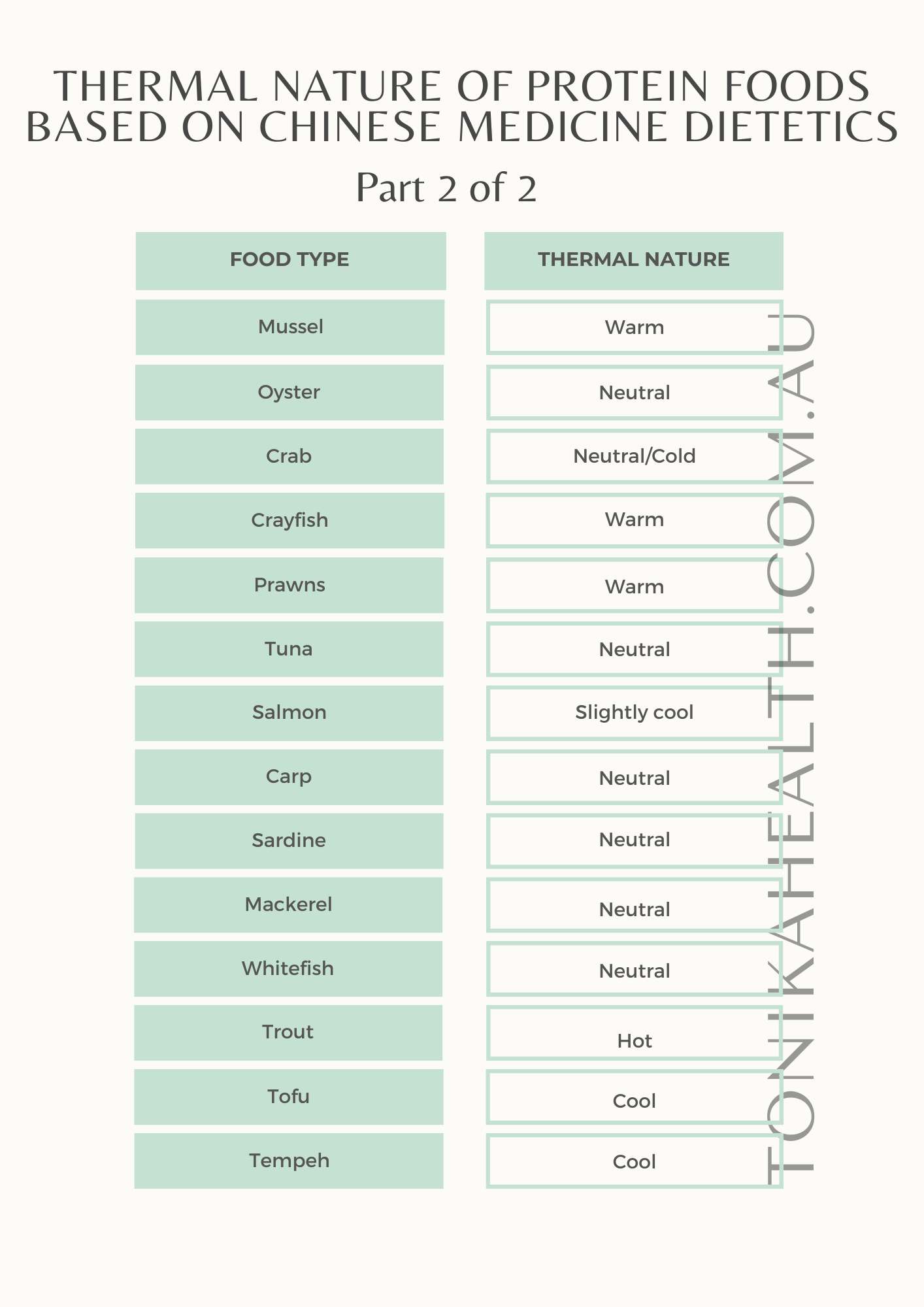 As this article is primarily focused on protein, and we don’t have the scope to provide a large list of other food groups, we have put charts together below with the different thermal natures of a variety of protein foods, so that you can use these charts to guide you in selecting protein foods based on their thermal nature.